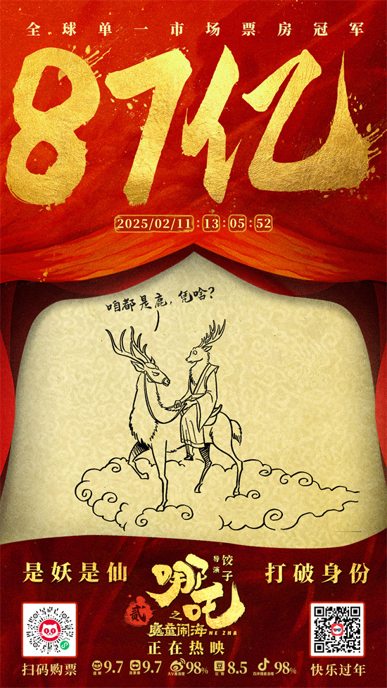 截至发稿,《哪吒之魔童闹海》继续以势如破竹的票房走势冲击着新的影史票房纪录,总票房突破87亿,助力2025年中国电影年度总票房突破160亿!