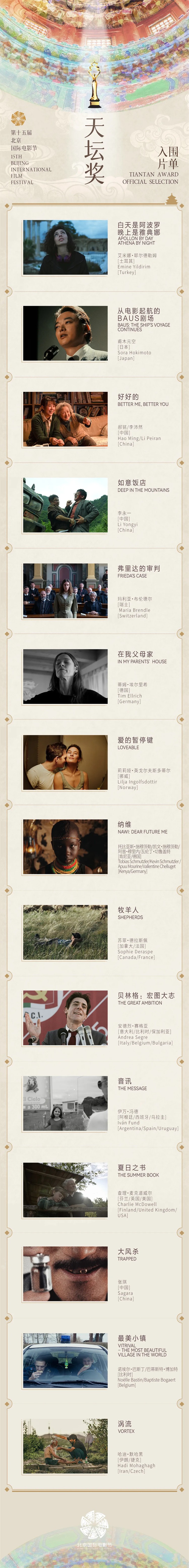 天坛奖最终入围15部作品,包括《好好的》《如意饭店》《大风杀》3部中国影片,《白天是阿波罗,晚上是雅典娜》《从电影起航的BAUS剧场》《弗里达的审判》《在我父母家》《爱的暂停键》《纳维》《牧羊人》《贝林格:宏图大志》《音讯》《夏日之书》《最美小镇》《涡流》12部国外影片,将共同角逐天坛奖十大奖项。