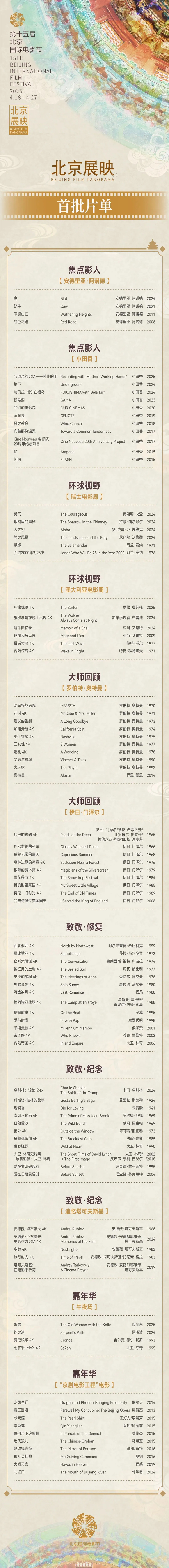 第十五届北京国际电影节红毯第二轮阵容来了!红毯星光汇聚,电影剧组结伴而来,评委阵容专业集结,红毯致敬影史经典,表演嘉宾动情演绎,因热爱相聚,光影逐梦扬帆起航!由姜文、陈冲、大卫叶茨、倪妮、泰穆尼基、文森特佩雷斯、叶锦添组成的天坛奖国际评奖委员会,贺峻霖、兰天奇..